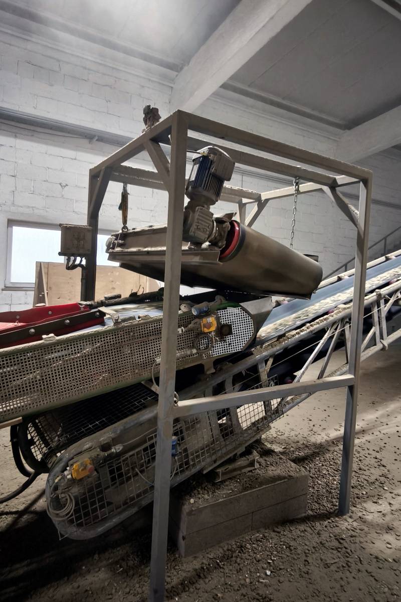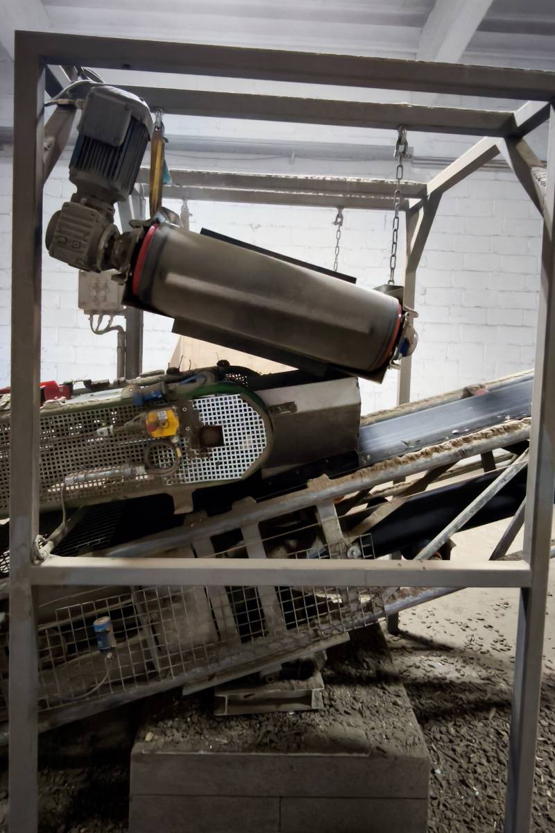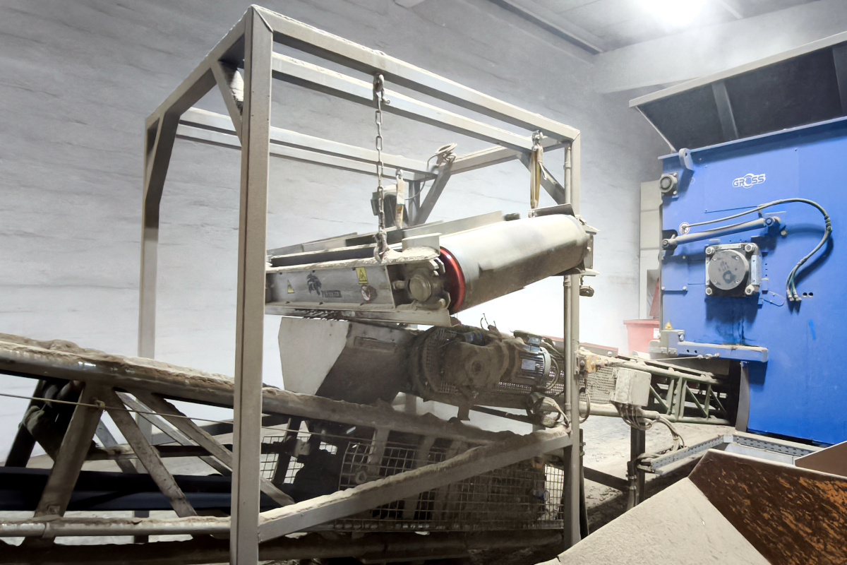 A szalagszállító fölé egy öntisztító DND-AC mágneslemezt szereltek fel, a szállítószalagra merőlegesen felfüggesztve. Feladata, hogy megbízhatóan megfogja a vas (ferromágneses) szögeket közvetlenül az aprított anyagáramból – kezelői beavatkozás és üzemmegszakítás nélkül.